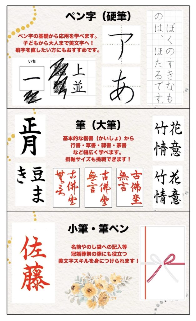 はい、まったくの初心者の方でも丁寧にサポートいたします。筆の持ち方から一緒に学んでいきますのでご安心ください。